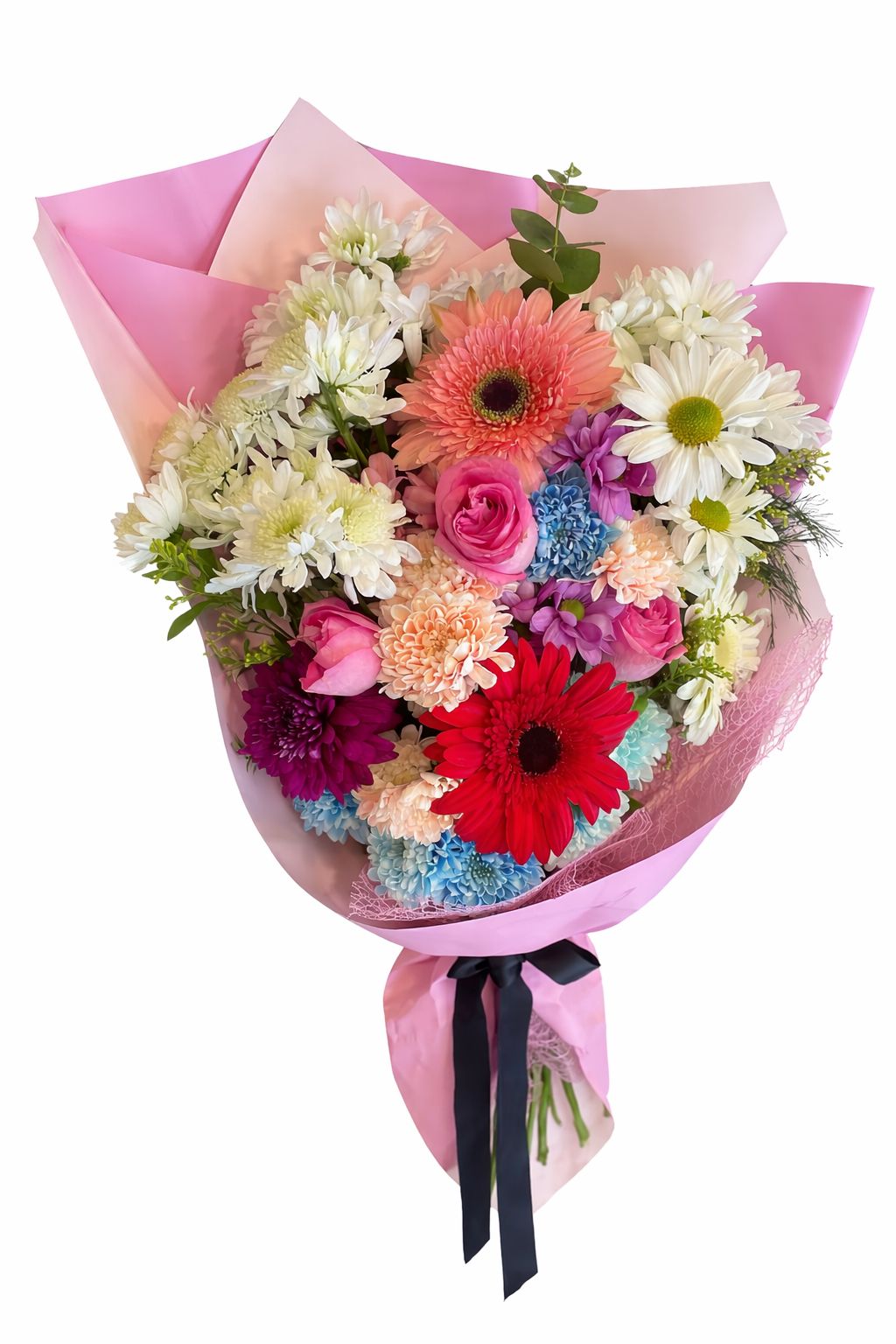 Karışık renkli çiçek buketi, sevdiklerinize duygularınızı en zarif şekilde ifade etmenin en güzel yollarından biridir. Özenleseçilen pembe güller canlı gerbere krizantem ve mevsimin en taze çiçekleri ile hazırlanan bu özel tasarım buket; şıklığı doallığı ve canlı renkleri ile her ortama mutluluk kadar