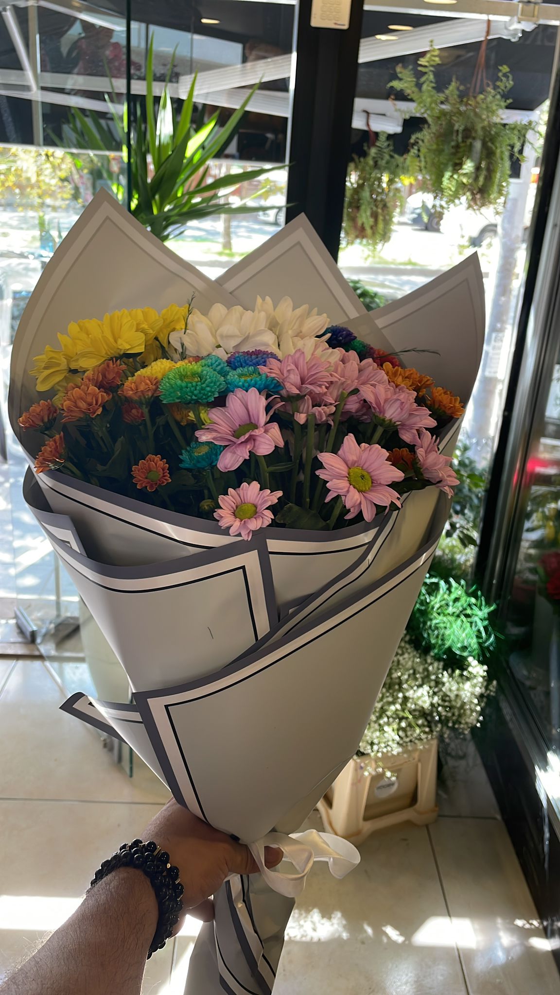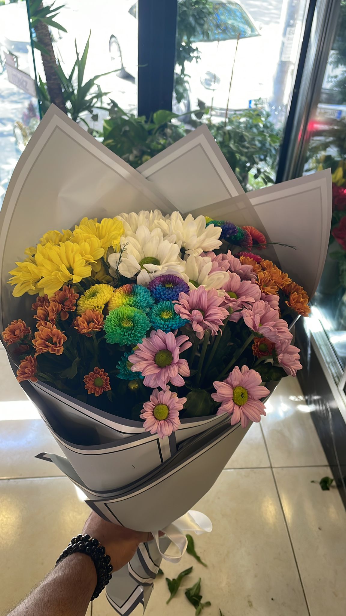 Renkli papatyalar,beyaz ve sarı krizantemler ile gökkuşağı tonlarında özel boyalı çiçeklerden hazırlanan bu buket,enerjisi yüksek,neşeli ve dikkat çekici bir tasarıma sahiptir.