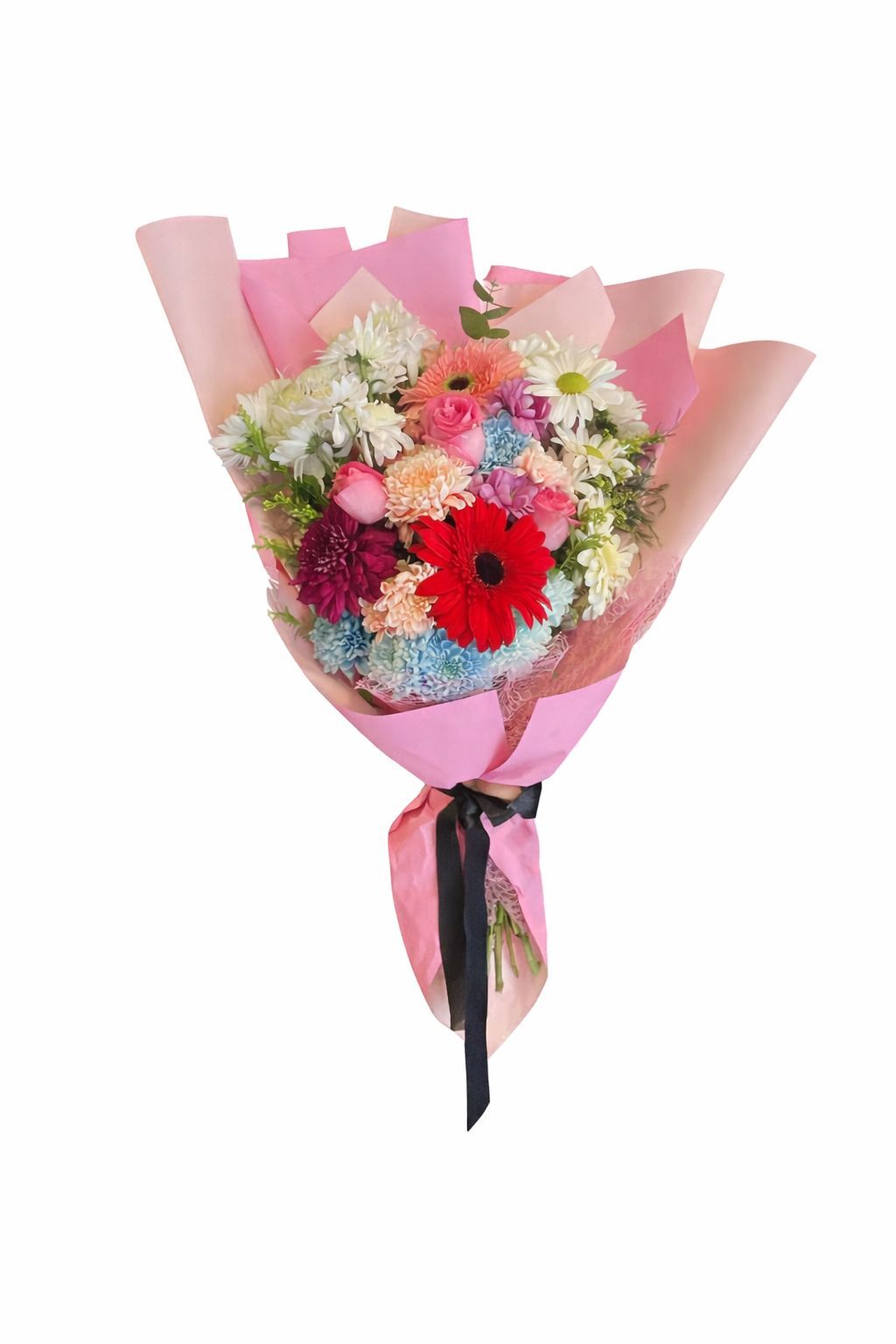 Karışık renkli çiçek buketi, sevdiklerinize duygularınızı en zarif şekilde ifade etmenin en güzel yollarından biridir. Özenleseçilen pembe güller canlı gerbere krizantem ve mevsimin en taze çiçekleri ile hazırlanan bu özel tasarım buket; şıklığı doallığı ve canlı renkleri ile her ortama mutluluk kadar